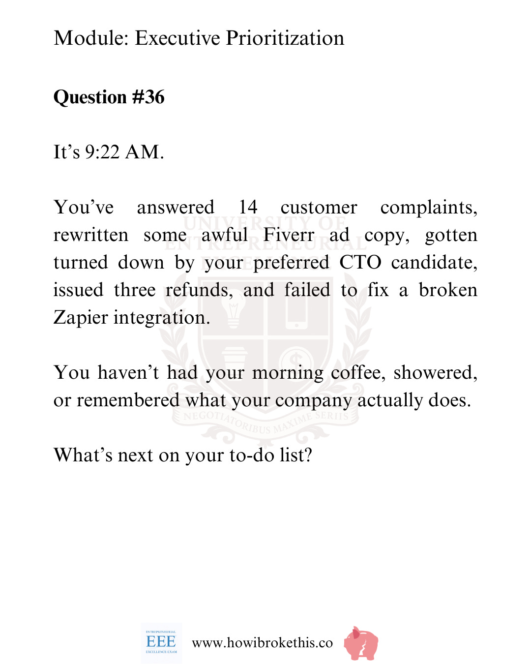 To start testing your Time Management knowledge, we start with this week’s Entrepreneurial Excellence Exam question (see below; bring No. 2 pencils).
