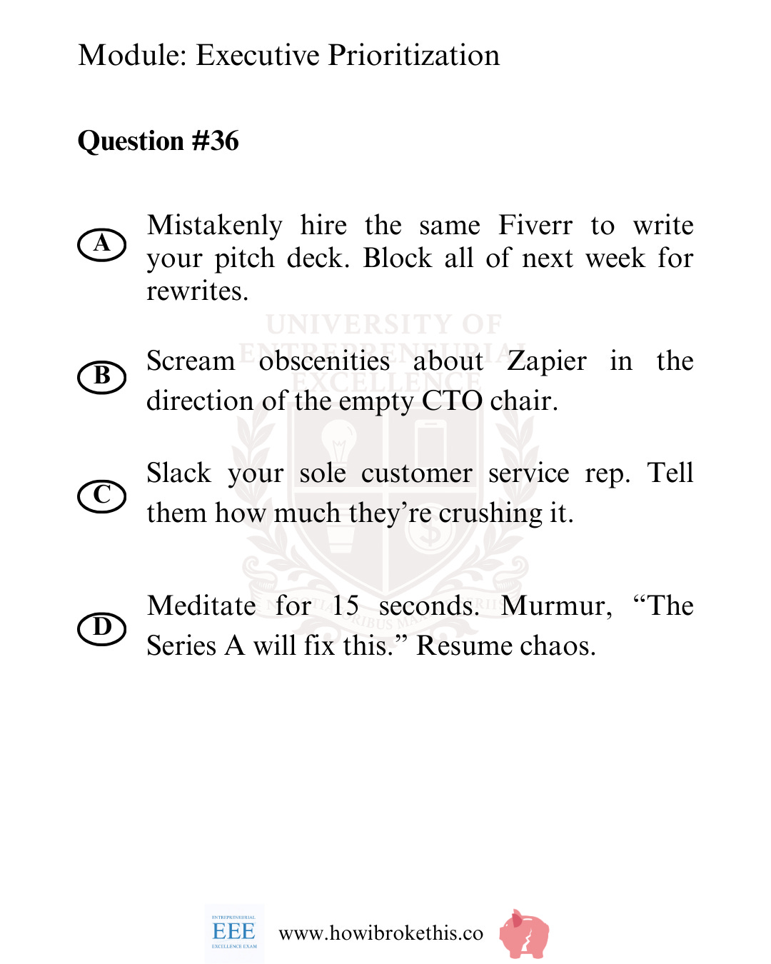 Test your knowledge with our Entrepreneurial Excellence Exam Question #36